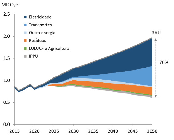 Nessas emissões, sobressai a contribuição de 65% do sector da energia e de acordo com as projeções constantes na Estratégia de Desenvolvimento de Baixas Emissões a Longo-Prazo (documento por publicar), esse valor poderá crescer 68% em 2030 e 72% em 2025, num cenário business as usual (BAU).