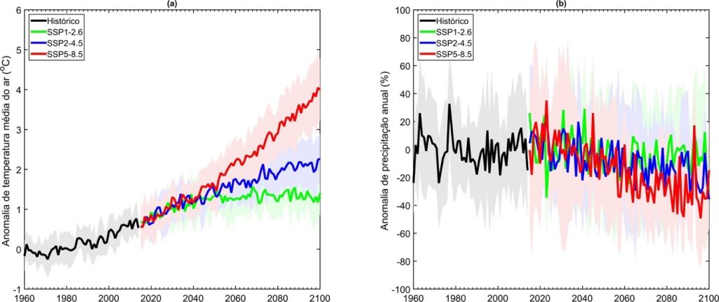 Future climate projections are generally articulated on the basis of three main economic development scenarios: the ideal one, based on drastic reductions in GHG emissions and ambitious sustainable development practices and energy transition to cleaner matrices, which would lead us to keep the global temperature increase below 2.0 degrees Celsius by 2100, another intermediate scenario characterized by the use of a series of technologies and strategies to reduce greenhouse gas emissions in which the increase would be between 2.0 and 3.7 degrees Celsius and, finally, the most critical, in which things remain as they have been in the past, i.e. development based on unrestricted consumption of fossil fuels with no ambitions in terms of sustainable practices, which would lead to an increase in the average global temperature of over 5.0 degrees Celsius.