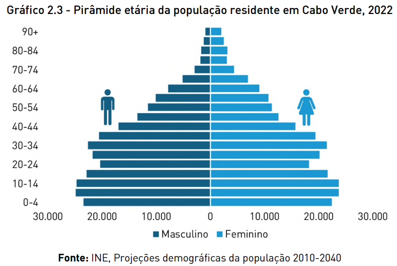 To better frame this reflection, let’s observe the age structure of the resident population in Cabo Verde in 2022: